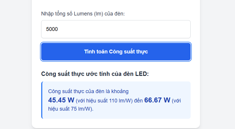 Ví dụ chúng ta có bóng đèn 5000lm sử dụng CHIP LED có hiệu suất phát quang là 110 lumen/w thì sẽ ra được kết quả như sau