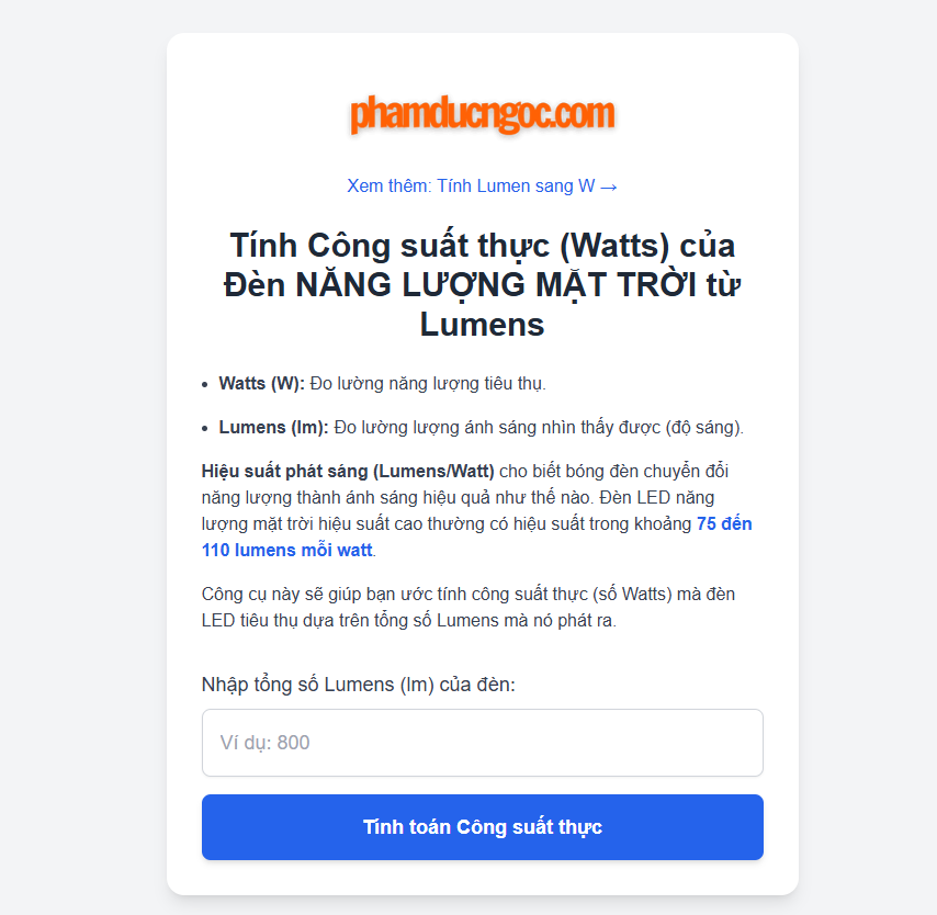 Bước 1: Truy cập vào công cụ tính Lm to W